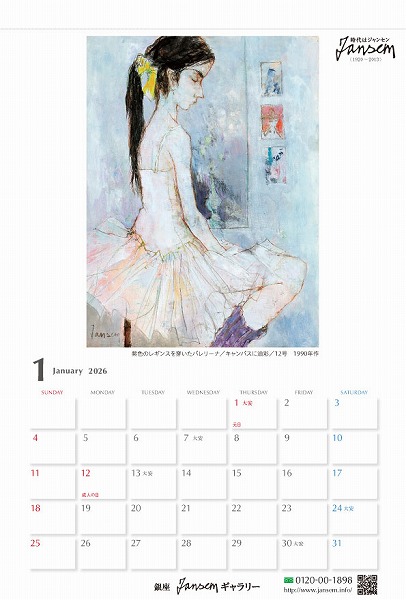 2025年11月17日(月) ■2026年ジャンセンカレンダー発売のお知らせ※ご案内: 40年以上に渡ってお付き合い頂きましたジャンセンカレンダーですが、 諸般の事情により今回の2026年版の発行を以って終了とさせていただきます。 長い間のご愛好に深く感謝申し上げます。ありがとうございました。 ![]() ![]() 発売日:2025年11月25日予定 フランス画壇の巨匠ジャン・ジャンセンの 秀作12点をカレンダーにしました。 優れたデッサン力、 にじみ出る色彩の温もり。 魂に語りかけるジャンセンの世界を、 存分に楽しめるカレンダーです。 【全13P オールカラー A4サイズ】 価格:¥1,000円(税込) ジャンセンギャラリー店頭にて発売します。 ※通販にてご購入希望のお客様は、こちらからお問い合わせください。 2025年8月8日 (金) ■夏季休業のお知らせジャンセンギャラリーの夏季休業期間は下記の通りです。 〔夏季休業期間〕 2025年8月9日(土)~8月18日(月) なお、期間中にいただきました各種お問い合わせにつきましては、 19日以降、順次対応させて頂きます。 夏季休業に伴い皆様にはご不便をおかけ致しますが、 何卒ご理解のほど、よろしくお願い申し上げます。 2023年12月26日(火) ■年末年始休業のお知らせジャンセンギャラリーの年末年始休業期間は下記の通りです。 〔休業期間〕 2023年12月28日(木)~ 2024年1月3日(水) なお、期間中にいただきました各種お問い合わせにつきましては、 1月4日以降、順次対応させて頂きます。 年末年始休業に伴い皆様にはご不便をおかけ致しますが、 何卒ご理解のほど、よろしくお願い申し上げます。 2023年12月5日(火) ■2024年ジャンセンカレンダー発売開始しました!!![]() ![]() フランス画壇の巨匠ジャン・ジャンセンの 秀作12点をカレンダーにしました。 優れたデッサン力、 にじみ出る色彩の温もり。 魂に語りかけるジャンセンの世界を、 存分に楽しめるカレンダーです。 【全13P オールカラー A4サイズ】 価格:¥1,000円(税込) ジャンセンギャラリー店頭にて好評発売中です。 ※通販にてご購入希望のお客様は、こちらからお問い合わせください。 2023年12月5日 (火) ■Xmas アートフェスタ2023開催のお知らせ![]() 今年もジャンセンギャラリーは 銀座ギャラリーズ主催“Xmas アートフェスタ” に参加します。 〈会期〉2023年12月8日(金)~12月16日(土) ※共通会期 〈時間〉各画廊の営業時間に準ずる 主催:銀座ギャラリーズ 「Xmas アートフェスタ」は銀座界隈のギャラ リーが2009年から開催している今年で第15回を迎えるアートイベントです。 日本にはアートを部屋に飾る習慣があまりありませんが、洋服やバッグを選ぶような感覚で自分好みのアートを選ぶことはとても楽しい体験です。 お気に入りのアートと暮らす生活をはじめてみませんか? [クリスマスフェス開催期間中の展覧会] ジャンセンギャラリーコレクション展 Ginza Jansem Gallery Collection 12.8 Fri. − 15 Fri. 10:00-17:00 土日休廊 Closed on Saturdays and Sundays フランス画壇で活躍したジャン・ジャンセンの大作を中心にビュッフェ、キスリング、ヴラマンク等の秀作を展示させて頂きます。 ごゆるりとお楽しみ頂けましたら幸いでございます。 An exhibition of masterpieces focusing on the major works of Jean Jansem, as well as other artists such as Bernard Buffet, Mojżesz Kisling, and Maurice de Vlaminck. We hope you enjoy it. 皆様の来場を心よりお待ち申し上げます。 イベント詳細については店頭で配布しております「Xmasアートフェスタ2023」のパンフレット、 または公式ホームページをご覧ください。 2022年12月07日 (水) ■本日より、2023年ジャンセンカレンダー発売開始!!![]() フランス画壇の巨匠ジャン・ジャンセンの 秀作12点をカレンダーにしました。 優れたデッサン力、 にじみ出る色彩の温もり。 魂に語りかけるジャンセンの世界を、 存分に楽しめるカレンダーです。 【全13P オールカラー A4サイズ】 価格 ¥1,000円(税込) ジャンセンギャラリー店頭にて好評発売中です。 ※Webでご購入のお客様はこちらからお問い合わせください。 2021年10月15日 (金) ■営業時間変更のお知らせ平素よりジャンセンギャラリーをご愛顧いただきまして、誠にありがとうございます。 この度、下記の通り営業時間を変更させていただきます。。 〔営業時間〕 午前10:00~午後17:30 ※なお今後の情勢により営業時間変更となる場合があります。 詳細につきましては、お手数ですが店舗へお電話にてお問合せください。 変更に伴い皆様にはご不便をおかけ致しますが、 何卒ご理解のほど、よろしくお願い申し上げます。 2019年11月22日 (金) ■Xmas アートフェスタ2019開催のお知らせ![]() 今年もジャンセンギャラリーは 銀座ギャラリーズ主催“Xmas アートフェスタ” に参加します。 〈会期〉2019年12月6日(金)~12月14日(土) ※共通会期 〈時間〉各画廊の営業時間に準ずる 主催:文化庁/東京アート&ライブシティ構想実行委員会/公益社団法人日本芸能実演家団体協議会/銀座ギャラリーズ ギャラリーは多彩な作品と出会えるアートの宝庫です。 クリスマス気分